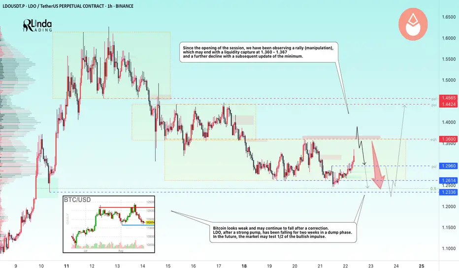 Bitcoin looks weak and, after a correction, may continue to fall to the coveted target of 112 - 110K. After a strong pump, LDO has been falling for two weeks in a dump phase. In the long term, the market may test 1/2 of the bullish momentum and the strong support level of 1.179 before resuming the pump to 1.62 - 1.97.