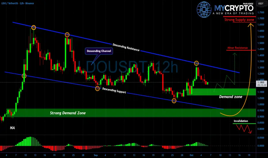 💎#LDOUSDT has been moving within a steady downward-sloping structure, with each touch of the lower boundary triggering a defensive bounce by buyers. This repeated defense shows that demand is still active at the lows, but the recent rejection from the channel top wasn’t followed by strong continuation. Instead, momentum indicators are flattening out, suggesting that bears may be losing control.