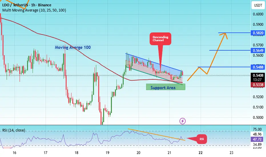 The price is moving in a descending channel on the 1-hour timeframe. It has reached the lower boundary and is heading towards breaking above it, with a retest of the upper boundary expected.