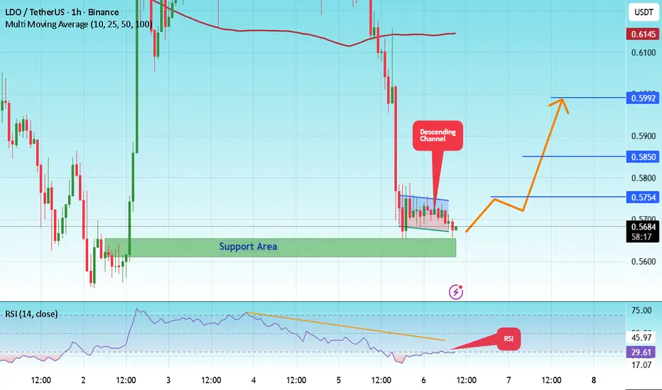 The price is moving in a descending channel on the 1-hour timeframe. It has reached the lower boundary and is heading towards a breakout, with a retest of the upper boundary expected.