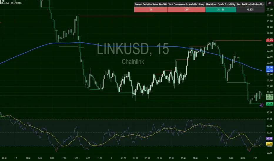 Chainlink trades at $21.78, consolidating near support at $21.60. RSI 43, suggesting modest recovery after oversold zone. Resistance sits at $22.68.