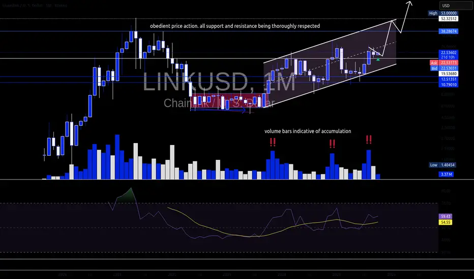 I've had the horizontal support and resistance for months now. Recently added the parallel channel. Link has been a slow horse relative to the rest of the market, but once in clears previous highs I'm of the opinion that she sends. made initial buy at the bottom of previous range and been dcaing for 2 years. Notable exchange outflows and big wallets accumulating. SWIFT goes live end of November. You been notified