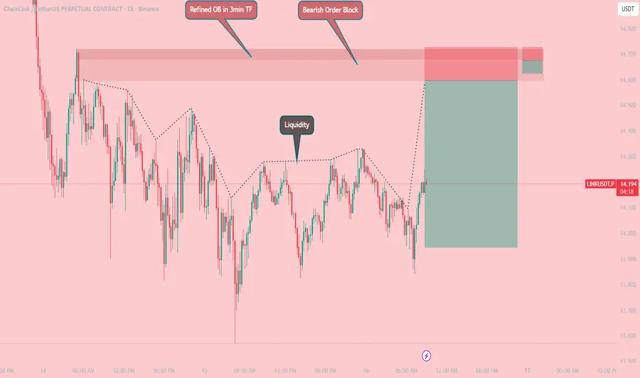 This refined zone aligns with a premium area of the range, making it a high-probability entry for a short setup. Price is expected to tap into the refined OB, sweep liquidity above equal highs, and then continue the downtrend.