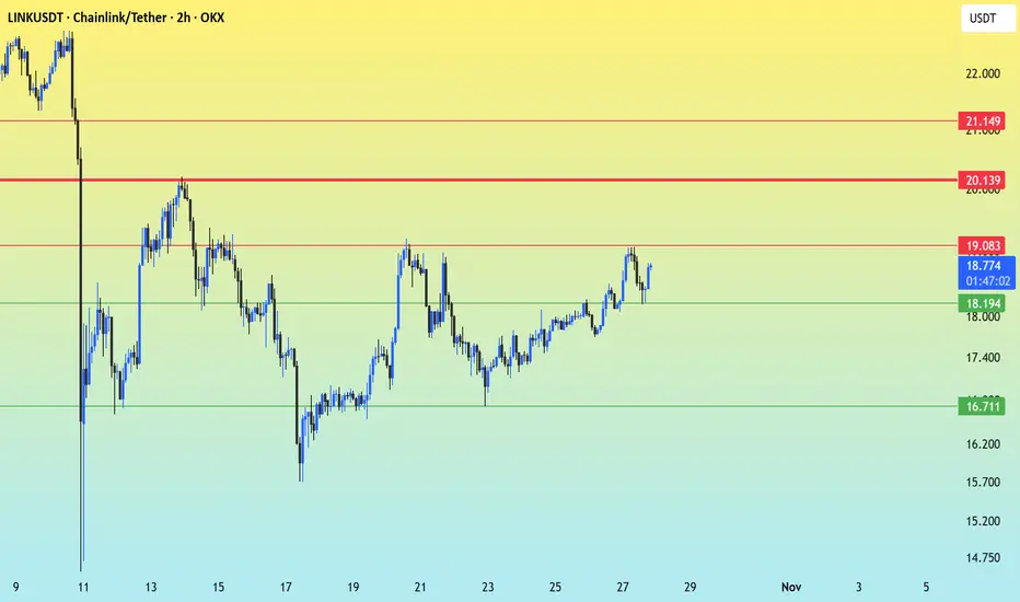 LINK/USDT is in a recovery and consolidation phase after a sharp decline, currently testing the upper boundary of its range with increasing bullish pressure. Following a significant drop around October 9th-11th, the price has been in a horizontal channel, showing higher lows since the $14.75 low. It is now challenging the major ceiling around $19.08, signaling buyer control.