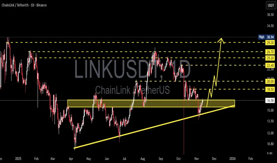 Chainlink (LINK) is now positioned at the most crucial zone in its mid-term technical structure — the 16.6–15.5 USDT area is not just a simple support, but a confluence zone between horizontal support and an ascending trendline that has been holding since April 2025.