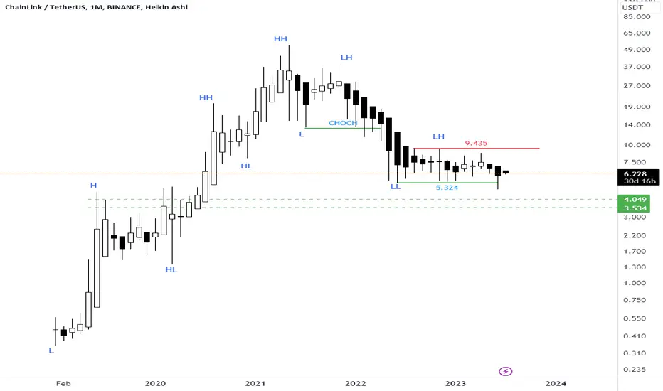 Considering that in the monthly time, the downward trend has started and continues, if it breaks 5.324, it is possible to check the price in the two green lines.