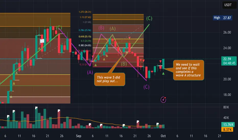 Our target of $27 did not play out as I thought with an extended wave 5. I think too much hype and too many leveraged long positions caused a breakdown in the play but we look good if we stay moving in the next few days to see a move to the upside with the same target likely.