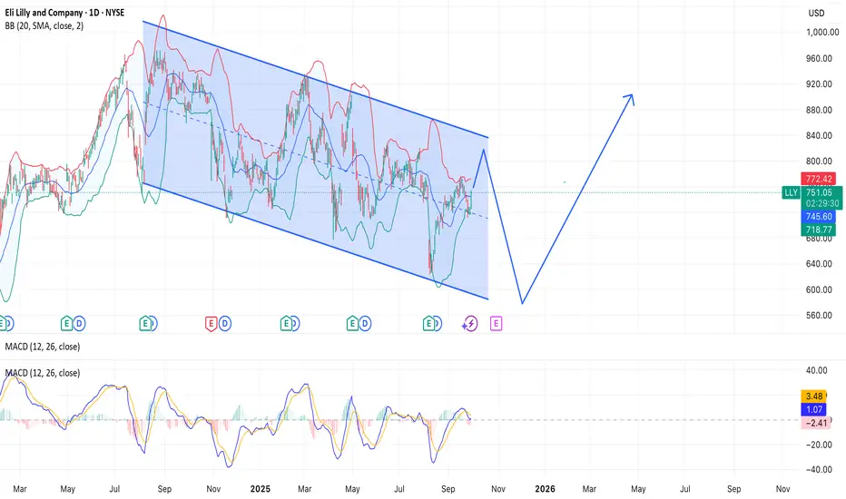 Current price (~752 $) is around the middle of the channel (Fib 0.5). There’s pressure from the upper boundary.