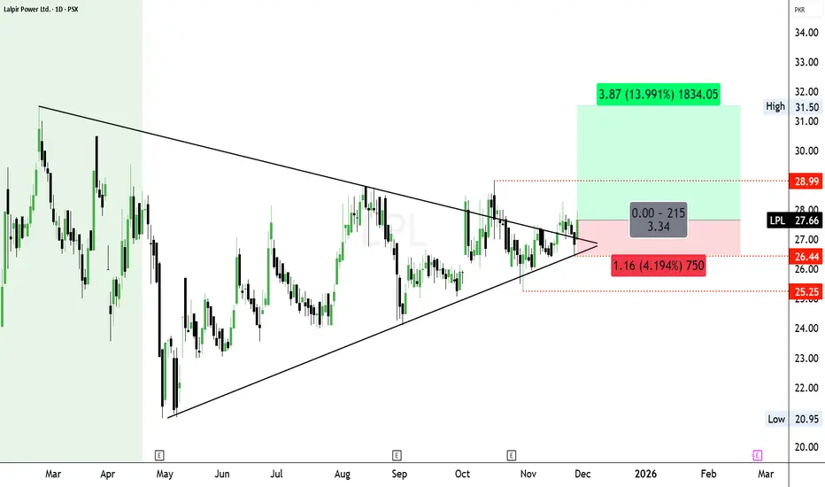 LPL is breaking out from a tightening symmetrical triangle, indicating growing bullish strength as price pushes above the resistance trendline. With momentum picking up, the chart shows room toward the upper target near 31.50, offering a potential upside of around 14%. A conservative stop is placed near 26.44–25.25 to manage risk in case the breakout doesn’t sustain.