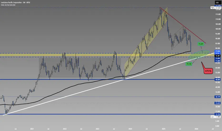 LPX is currently on its weekly EMA! After starting its decline from $121, LPX is now approaching the long-term ascending channel support. At the same time, this region coincides with a horizontal support zone between $71–75, which could offer a good buying opportunity but it’s important to watch the price closely.