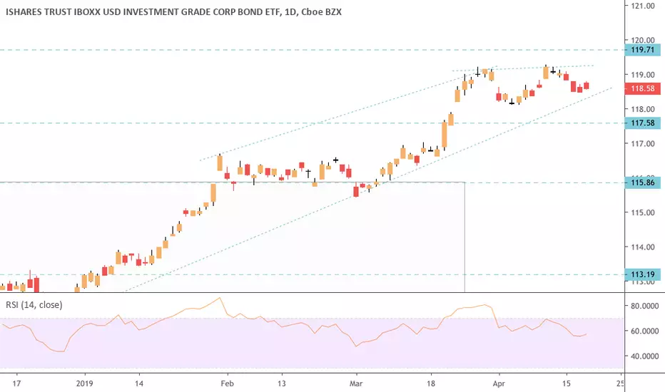 In my previous LQD study I outlined a possibility to use the LQD as a leading indicator for equities. Looking at the daily chart a few weeks later we can see that the price is within a well defined wedge. Perhaps, the next week will bring a test of the wedge boundary. If there is an impulse breakdown it would be worth watching its effect on the direction of equities and perhaps to be cautious about investing in equities at that time. Let’s see if the LQD provides any hint.