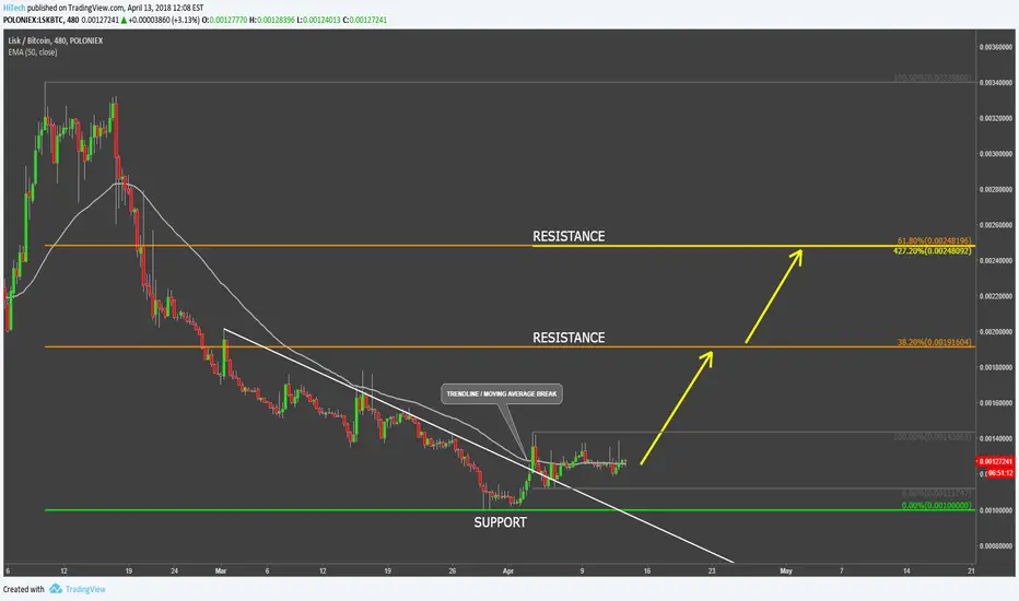 Lisk has found the bottom at precisely 100k satoshis. This is truly a very strong psychological support that clearly was rejected. The following wave up resulted in the break above the downtrend trendline as well as 50 Moving Average simultaneously.