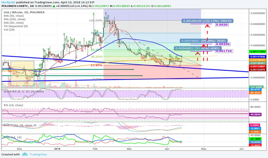 LSKBTC is accumulating nicely. After a failed breakout (due to a hidden bullish divergence) it is now hovering between MA20 and MA50. If it will manage to go over MA50 it can reach the first target on a short term and the 2 other targets on a medium run. There is also the possibility to go down first (cca 15% max) and then start a bull run.