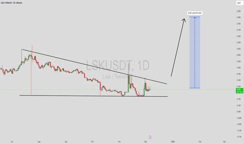 LSKUSDT is forming a clear falling wedge pattern, a classic bullish reversal signal that often indicates an upcoming breakout. The price has been consolidating within a narrowing range, suggesting that selling pressure is weakening while buyers are beginning to regain control. With consistent volume confirming accumulation at lower levels, the setup hints at a potential bullish breakout soon. The projected move could lead to an impressive gain of around 190% to 200% once the price breaks above the wedge resistance.