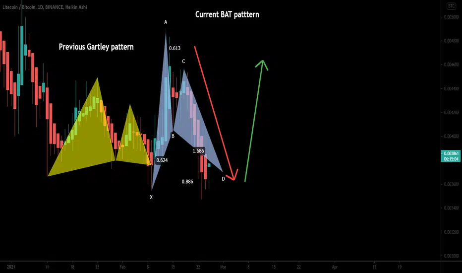 On the daily time period chart, the price action of the LTC coin with the Bitcoin pair chart has the final leg of bullish BAT and entered the potential reversal zone.
