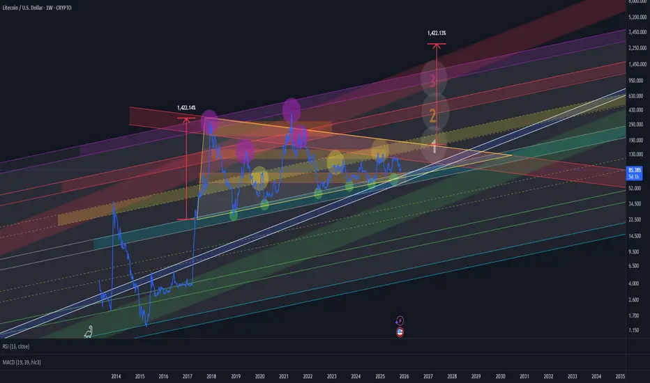 From this zone, long-term positions can be built with partial profit-taking targets at the yellow, red, and violet zones — each representing stages of distribution and de-risking from the accumulated position.