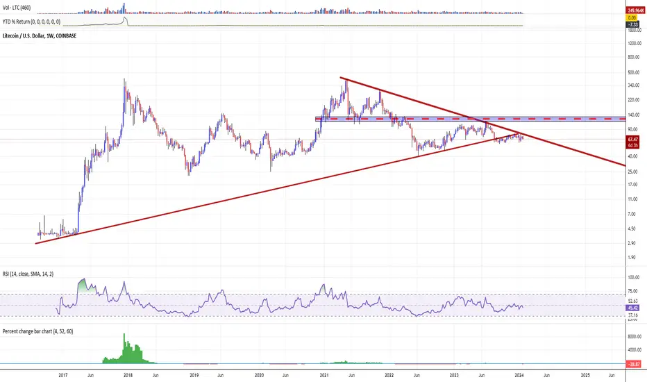 LTCUSD at the same time indicates a continuing deflationary price compression, with possible prospects for a further price decline within the boundaries of a downward channel to multi-year/ historical lows.