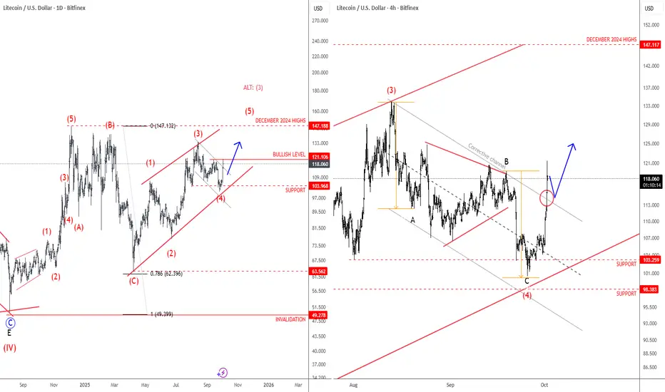 Litecoin turned lower recently, but we believe this is just another corrective retracement within a broader bullish trend, which has been showing higher swing lows since the rebound from the 78.6% Fibonacci level back in April. We expect that retracement down from the December highs will be fully retraced, meaning there’s room for a push up toward 147 as illustrated on a daily chart. It can be looking for wave (5) of a diagonal pattern, or alternatively, maybe even wave (3) if it extends decisively above upper diagonal line and goes for 200 area. In the 4-hour chart, we got a sharp rebound from projected support and back above channel resistance line after we noticed an ABC correction, so bulls are back, and we may easily see more gains toward December 2024 highs, just watch out for short-term pullbacks.