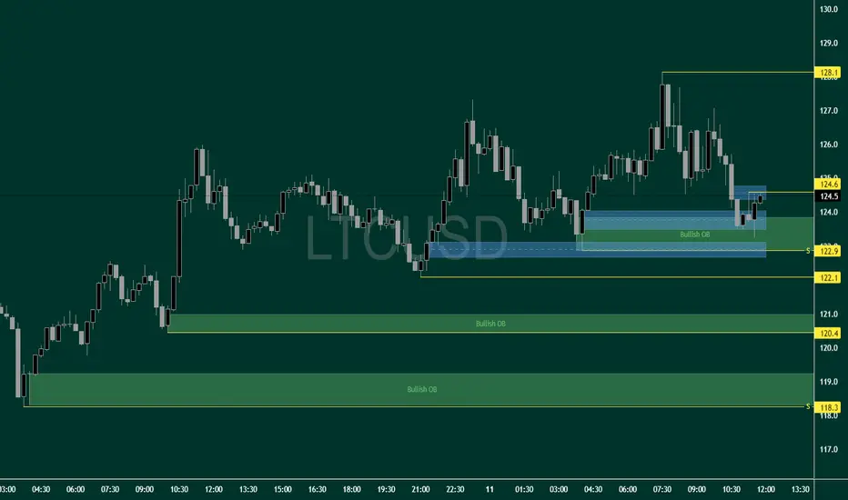 FenzoFx—Litecoin dipped to the bullish order block. A close above $124.6 with a fair value gap could trigger the uptrend, targeting recent highs at $128.1.