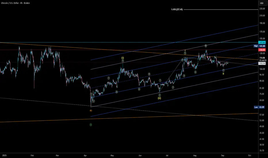 LTC/USD pair seems to getting out of a running flat correction (the last ABC in light green), building a 1-2, 1-2 (nested 1-2). This structure shall give us some ripping candles to the upside very soon. The confirmation of the inner 1-2 is at the 1.6 = 227USD, if we don't build another 5 waves, 3 corrective to keep nesting.