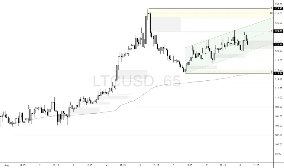 FenzoFx—Litecoin remains in a bullish channel, with the current wave originating from the order block at $115.2. LTC now trades around $121.7.