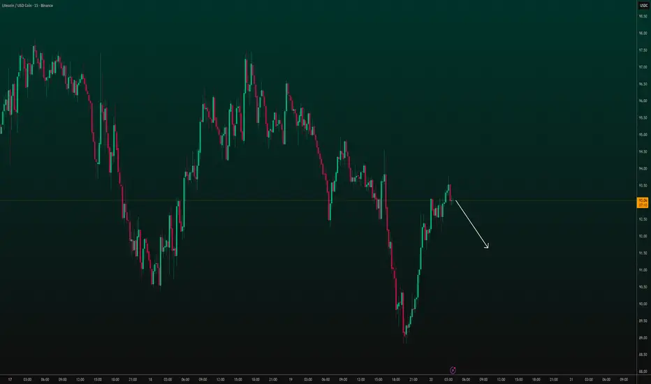 After a recent bounce, price is showing signs of a potential pullback. The white arrow suggests further downside movement in the short term.