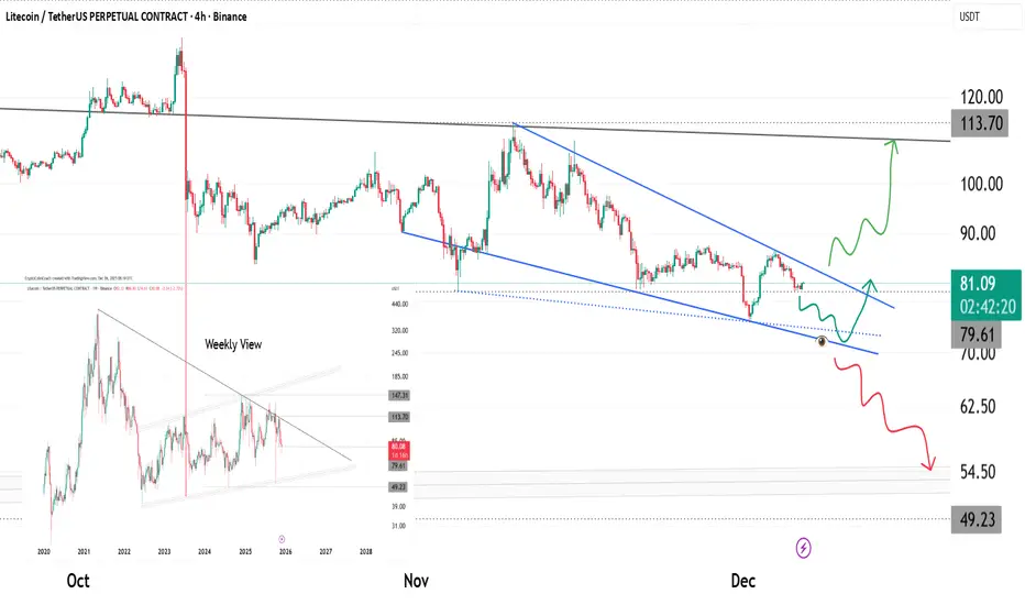 • Bearish scenario: Losing the lower wedge line + breakdown from 79–80 can send LTC toward 54–49 demand.