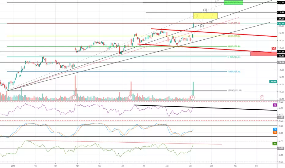 LULU will break up targeting new all time highs , now projected at 230 and next resistance are 209-218-230 Support will be red color channel. The expected scenario is to jump to 230 then drop to 158-168 during end of this year or begin of 2020 as flag sign located then it will be good opportunity for long-term long positions .. we can see RSI break up and MFI still on line Monday will confirm .