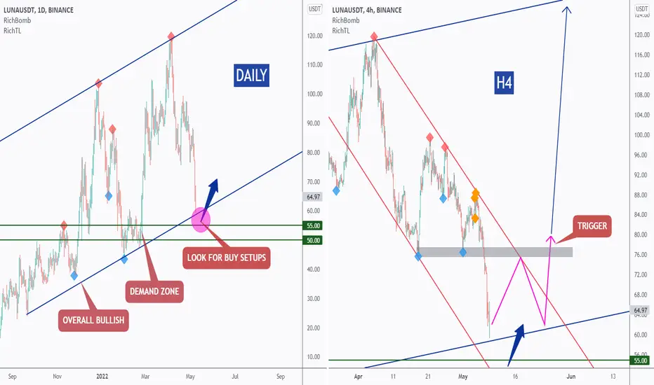 LUNA is forming a channel in red but the upper trendline is not valid yet, so we are waiting for a new swing high to form around it to consider it our trigger swing. (projection in purple)