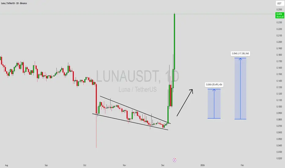 LUNAUSDT is forming a clear falling wedge pattern, a classic bullish reversal signal that often indicates an upcoming breakout. The price has been consolidating within a narrowing range, suggesting that selling pressure is weakening while buyers are beginning to regain control. With consistent volume confirming accumulation at lower levels, the setup hints at a potential bullish breakout soon. The projected move could lead to an impressive gain of around 90% to 100% once the price breaks above the wedge resistance.