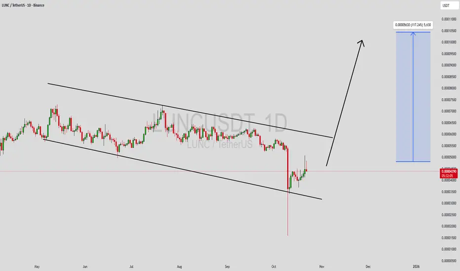 LUNCUSDT is currently forming a falling wedge pattern, one of the most reliable bullish reversal setups in technical analysis. This pattern indicates that the asset may be nearing the end of its downtrend, preparing for a breakout to the upside. The narrowing price range suggests that selling pressure is weakening while buyers are gradually stepping in, supported by good trading volume. This combination often signals an imminent price reversal and potential for a strong bullish move.