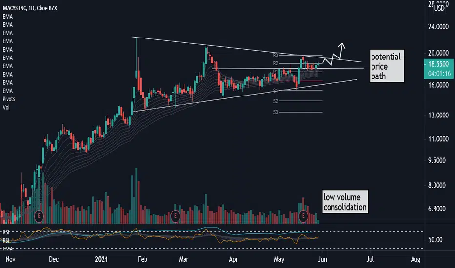 The share has been consolidation in a sideways range since late February, with a series of high lows and lower highs resulting in a medium term pennant formation. Recently, we saw the share run into earnings after which it has been in a short term low volume consolidation.