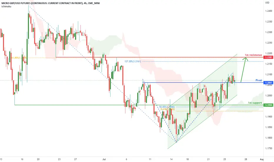Preferred Case: On the H4, with prices moving within an ascending channel and above the ichimoku indicator, we have a bullish bias that price will rise from the pivot at 1.2061 where the pullback support is to the 1st resistance at 1.2181 where the overlap resistance, 61.8% fibonacci retracement and 127.2% fibonacci extension are.