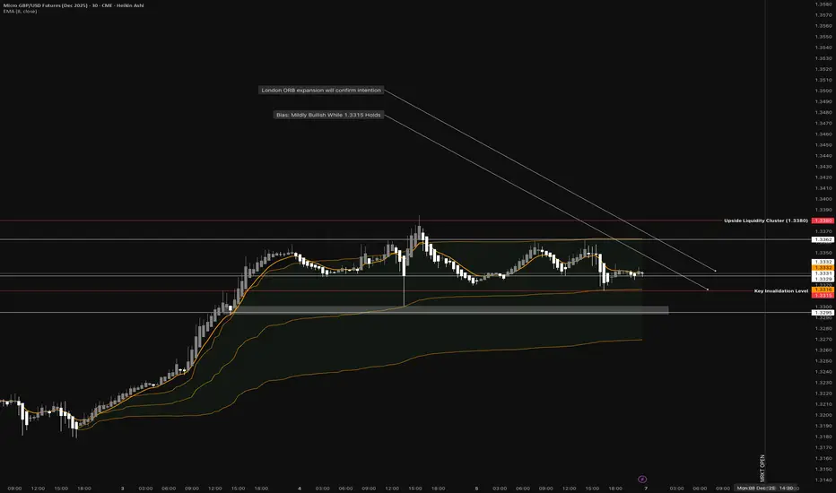 Structure remains mildly bullish while this shelf holds, with London ORB expected to reveal intent: acceptance back above 1.3345 would likely re-open the path toward 1.3380 and the clean highs beyond, whereas a decisive break below 1.3315 would flip the model into corrective mode and target the unfilled inefficiency down toward 1.3280. Momentum has flattened, signalling compression rather than trend reversal the next session provides the expansion.