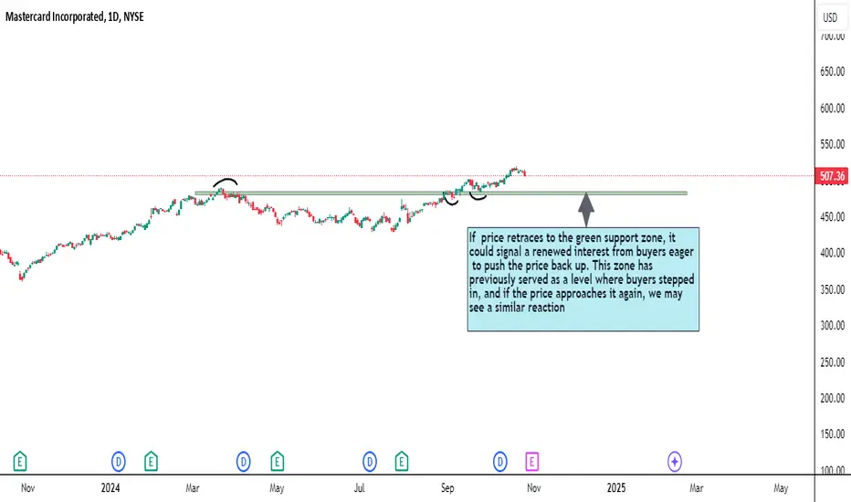 If Mastercard’s price retraces to the green support zone, it could signal a renewed interest from buyers eager to push the price back up. This zone has previously served as a level where buyers stepped in, and if the price approaches it again, we may see a similar reaction. My strategy is to wait for signs of a bounce in this area, as it could provide a strong entry point for a long position. By observing price action and looking for bullish confirmation in the green zone, this setup could offer a promising opportunity for a move to the upside. Patience is key here, as I’ll only consider entry once there’s clear evidence of buyers returning.