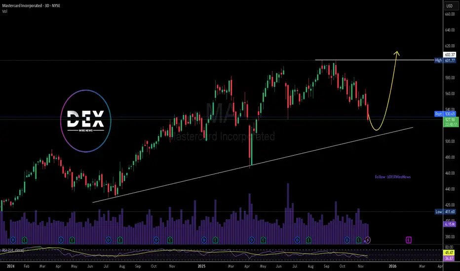 Mastercard’s stock is pulling back toward a multi-year ascending trendline, aligning with a major liquidity zone below the $527 low. The chart shows a potential sling low forming, with price rebounding from trendline support historically before rallying toward prior highs.