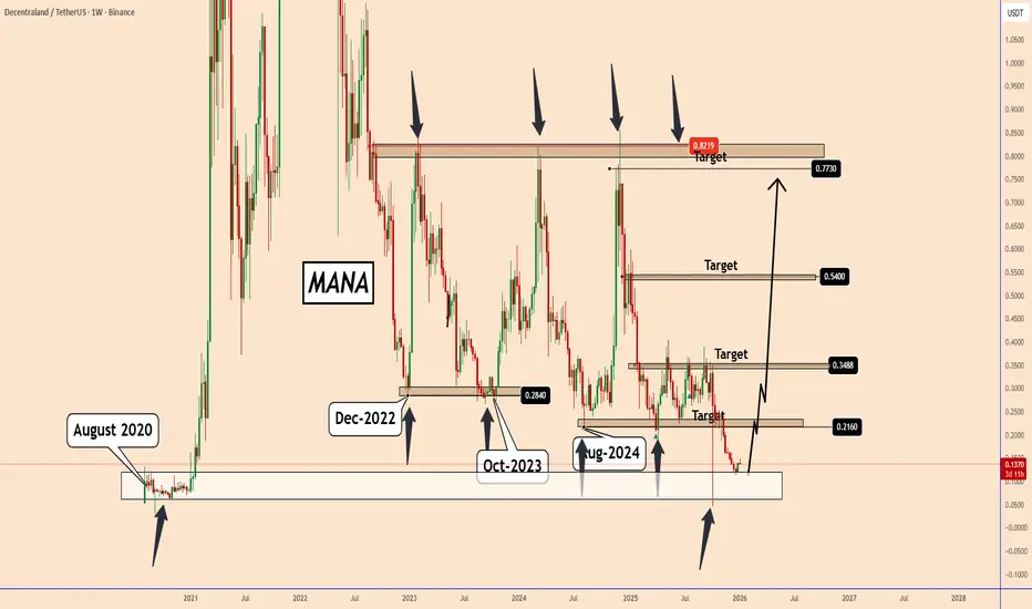 MANA is currently trading at a very important long-term support area that has been respected multiple times in the past. This zone dates back to August 2020 and has also acted as a strong reaction level in December 2022, October 2023, and August 2024, confirming its significance.