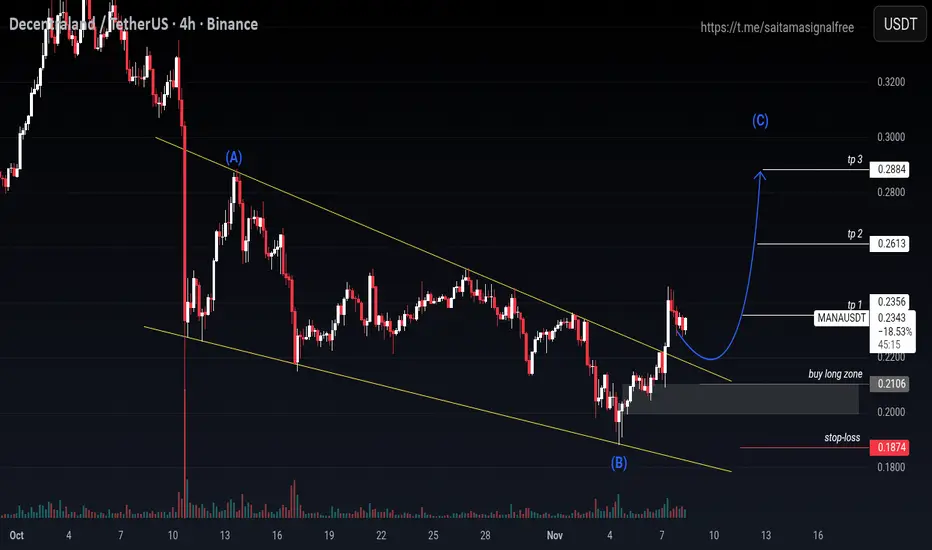 MANA/USDT 4H chart was previously in a descending channel (regular decline). Points (A) and (B) here illustrate a corrective pattern similar to the Elliott Wave ABC structure, where: (A) = corrective peak (B) = corrective bottom (strong support) The next logical target is (C), which is a rebound/relief rally. And indeed, a breakout from the descending channel has been seen, indicating the end of the downward phase and the market has entered the initial phase of an uptrend.