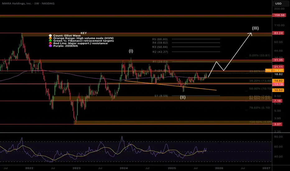 MARA’s Elliot Wave (II) retracement front run the Fibonacci golden ratio and has now overcome the weekly 200EMA. The weekly pivot looms as strong resistance $21 just above the first target of our recent trade signal. If wave (III) is underway we should see price begin to accelerate alongside Bitcoin with an initial target of $31 followed by $80 High Volume Node.