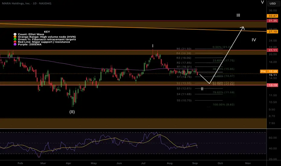 The S2 pivot and Fibonacci golden pocket should see strong support and potential bottoming of wave II, $13.20