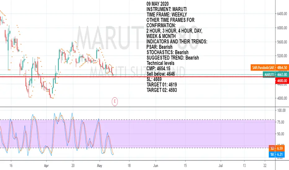 My analysis of MARUTI is expected to continue its downtrend for some time now. On weekly timeframe Stochastic has just become bearish. Whereas in the day time frame it is clearly bearish.