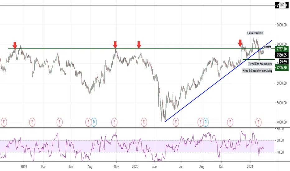 Breakout failure, breakdown of rising trend line, retest, head and shoulder in the making.