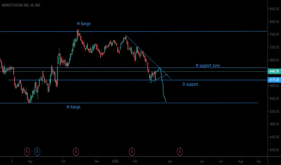 Maruti stock is trading in monthly time zone and clearly is in downtrend with making higher high and higher low and recently its decisively break the monthly support and took the rest at daily support range. now it will retrace till the monthly support zone and monthly support zone will react as a resistance for the retrenchment . after that it will continues his downtrend.