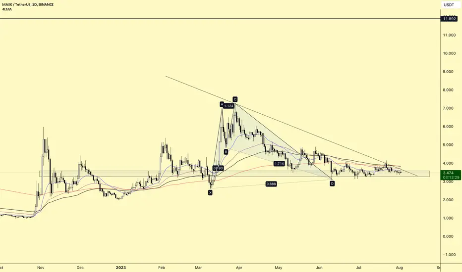 MASK Formed out Descending Triangle pattern as well as a Bullish Harmonic Shark pattern level where the price action is consolidating in a compression level on the Horizontal Support level