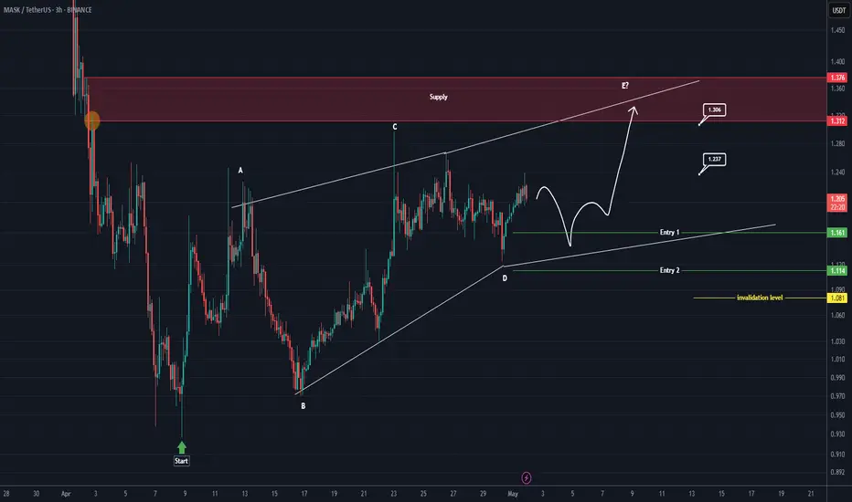 Since we placed the red flash on the chart, it seems that the bullish phase of MASK has started. This phase appears to be either a diametric or a symmetrical pattern. We are currently in the middle of wave D. After wave D completes, the price could enter a bullish wave E.