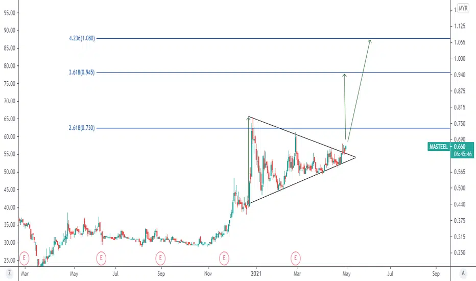 We notice a price breakout above the Symmetrical Triangle, hence we are optimist on further bullish movement towards minimum target at 0.945, followed by 1.08 if the buying momentum still persist. Nearest support is seen at 0.58.