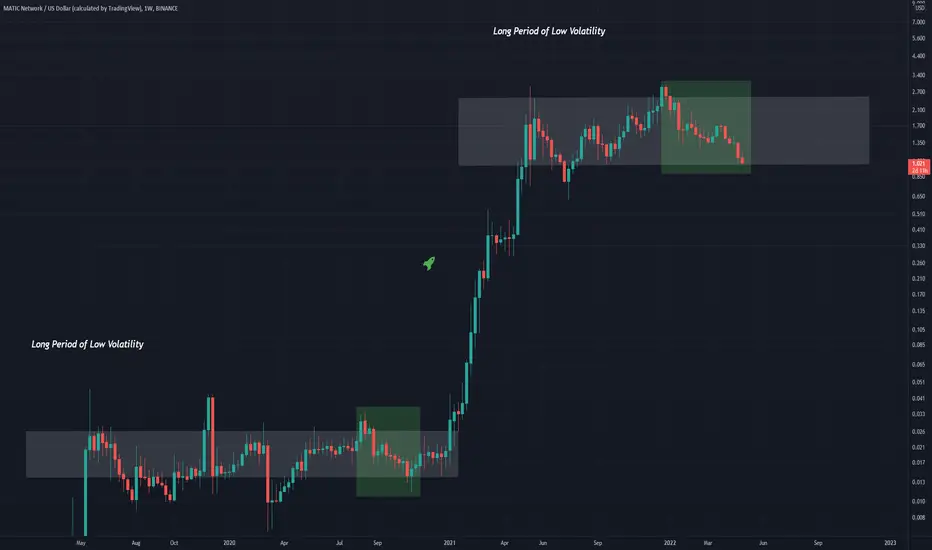 An observation of the MATICUSD log chart which shows a prior long period of low volatility which led to extreme growth