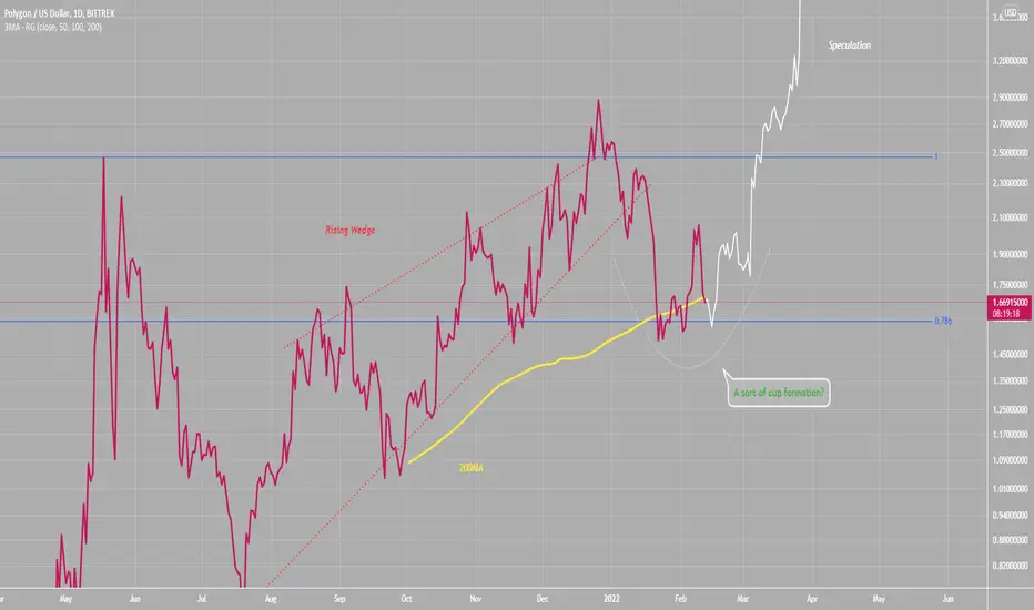 I would like to see a sort of cup (like on a cup and handle) form following the rising wedge, this places it in a very bullish position