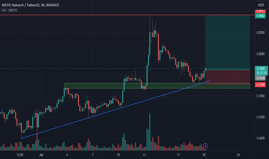 MATIC bounced off the ascending trendline and bounced off the support area. Bullish movement to resistance level at 0.89 is expected to happen.