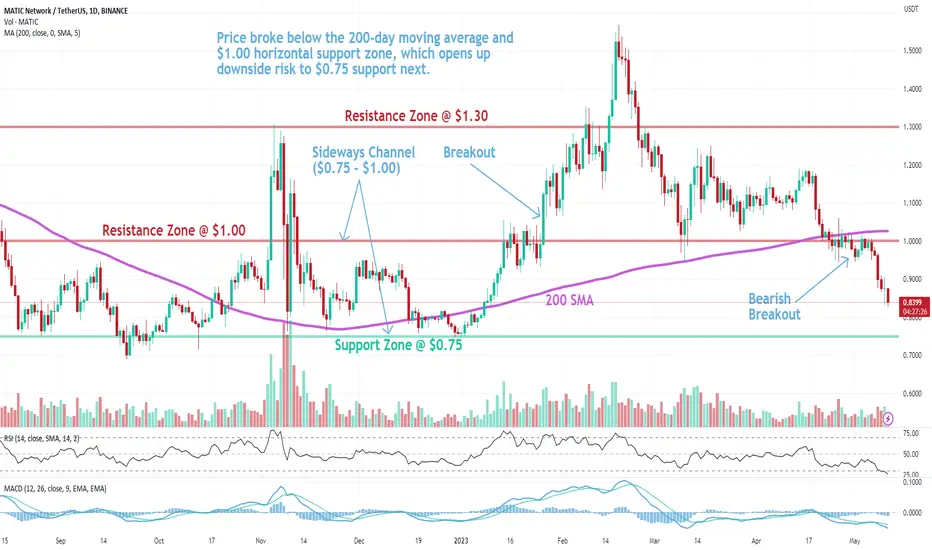 Trade setup: Price broke below the 200-day moving average and $1.00 horizontal support zone, which opens up downside risk to $0.75 support next.